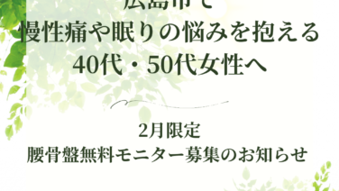 お知らせ等 【広島市で慢性痛や眠りの悩みを抱える40代・50代女性へ】2月限定・腰骨盤無料モニター募集のお知らせ