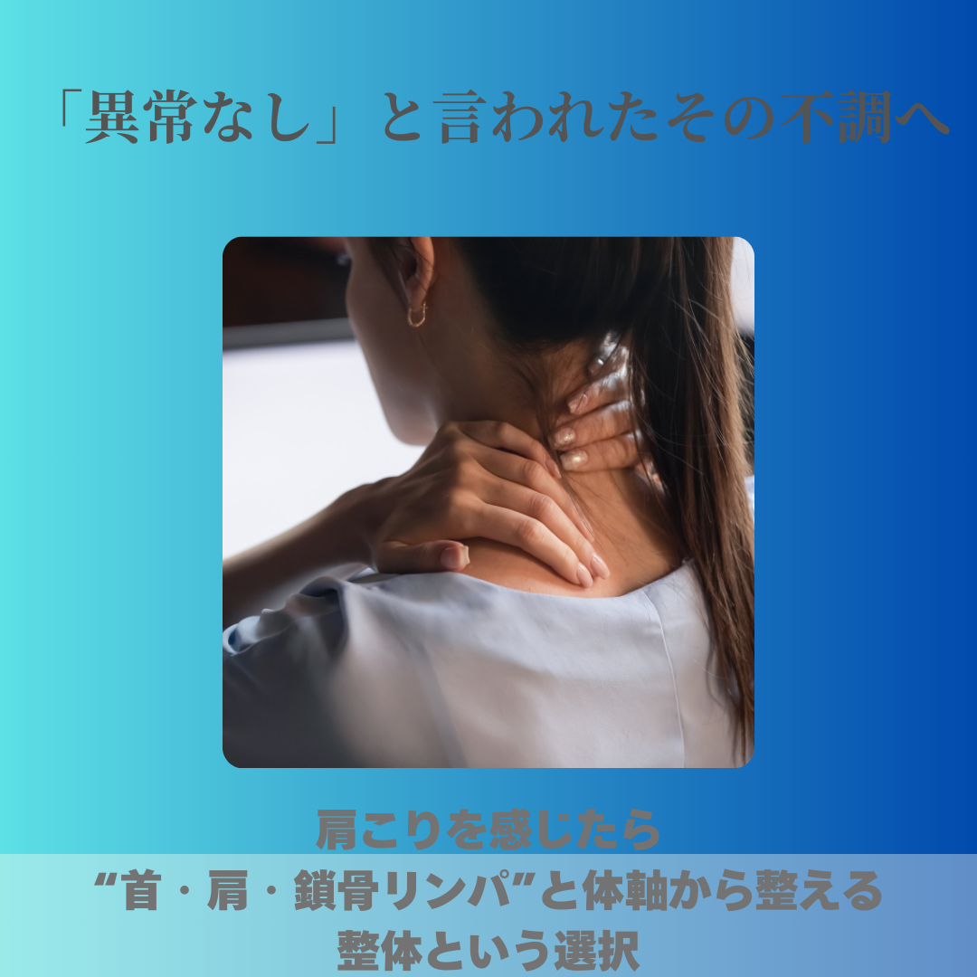 すると老廃物が溜まり、肩こりだけでなく、首こり・頭痛・だるさ・眠りの浅さへとつながっていくのです。