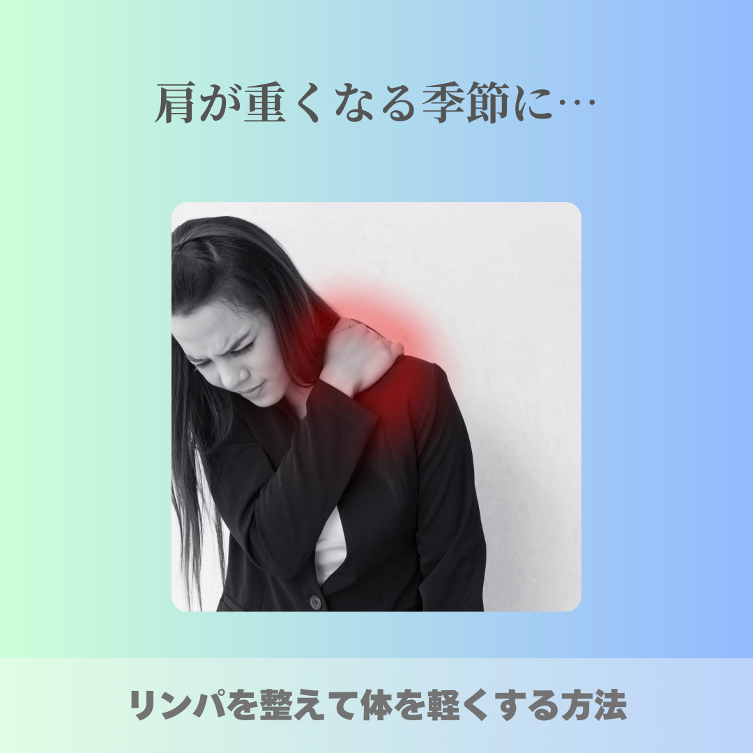 肩が重くなる季節は、体が発するサインです。「なんだか体が重い」「肩や首がだるい」と感じたら、リンパや血流、骨盤・背骨・股関節のバランスを整えることで、症状を改善できます。