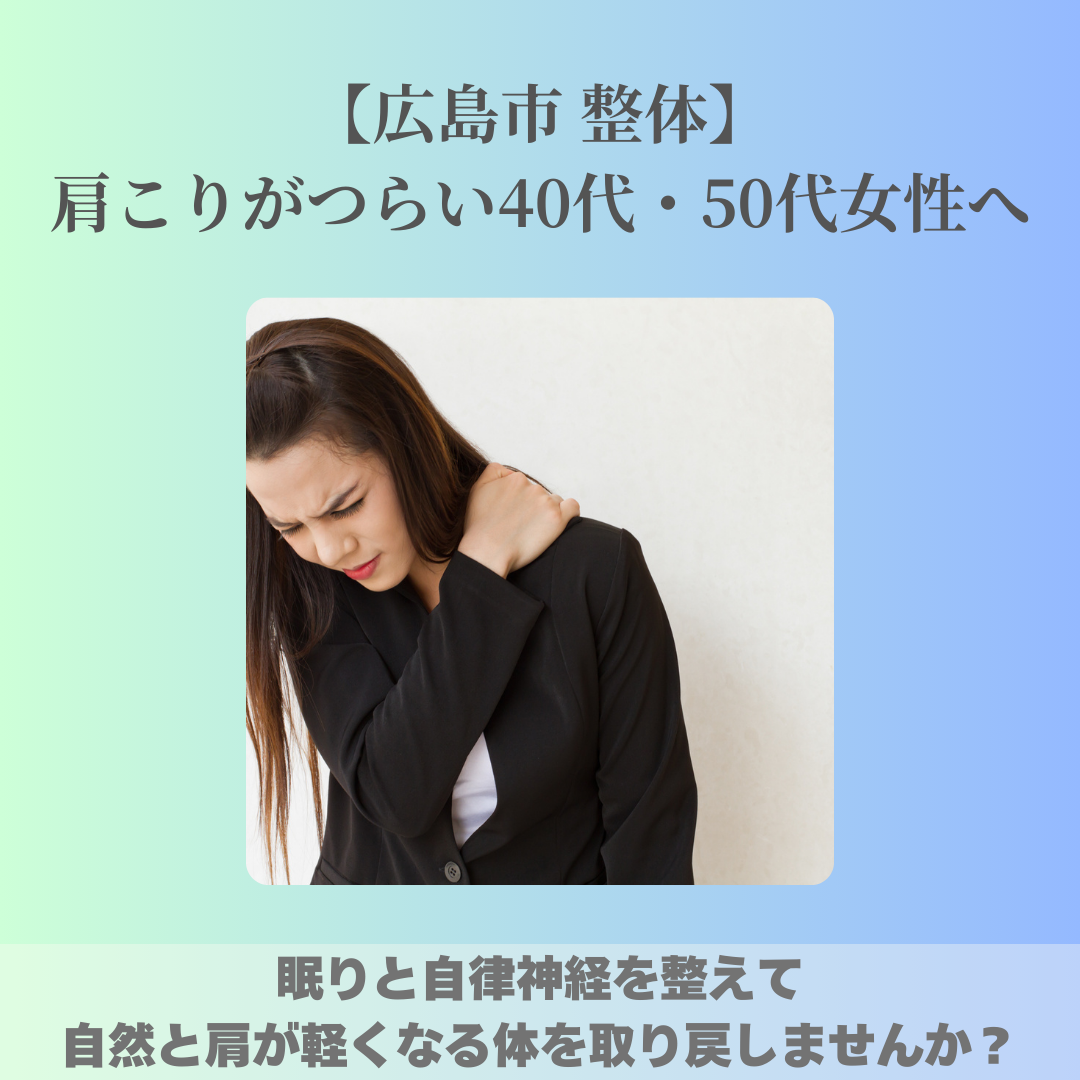 【広島市 整体】 肩こりがつらい40代・50代女性へ 眠りと自律神経を整えて、自然と肩が軽くなる体を取り戻しませんか?
