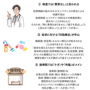 自律神経の乱れやホルモンバランスの変化は、血液検査や画像診断では見えにくいため、「異常なし」と言われがちです。