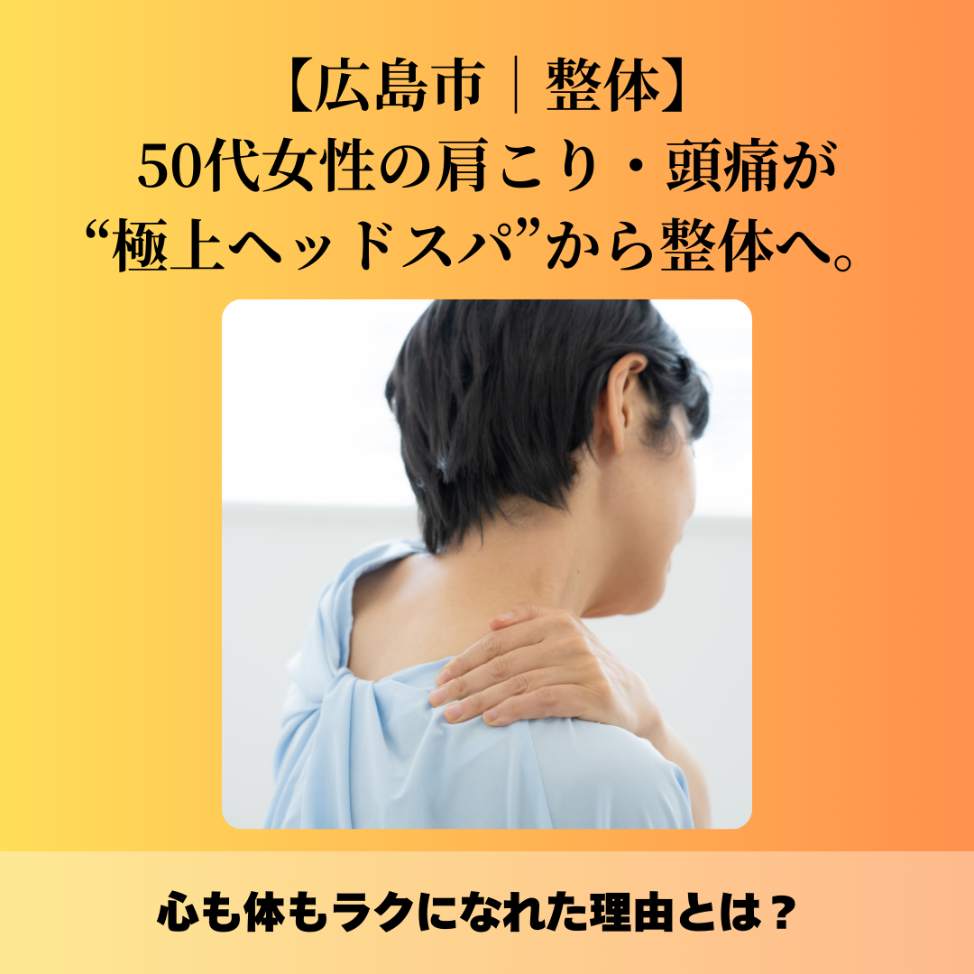 今回は、ある50代女性の「つらい肩こり・頭痛・倦怠感」が、“極上ヘッドスパ”をきっかけに整体施術へとつながり、心も体もスッキリ変化していった体験談をご紹介します。