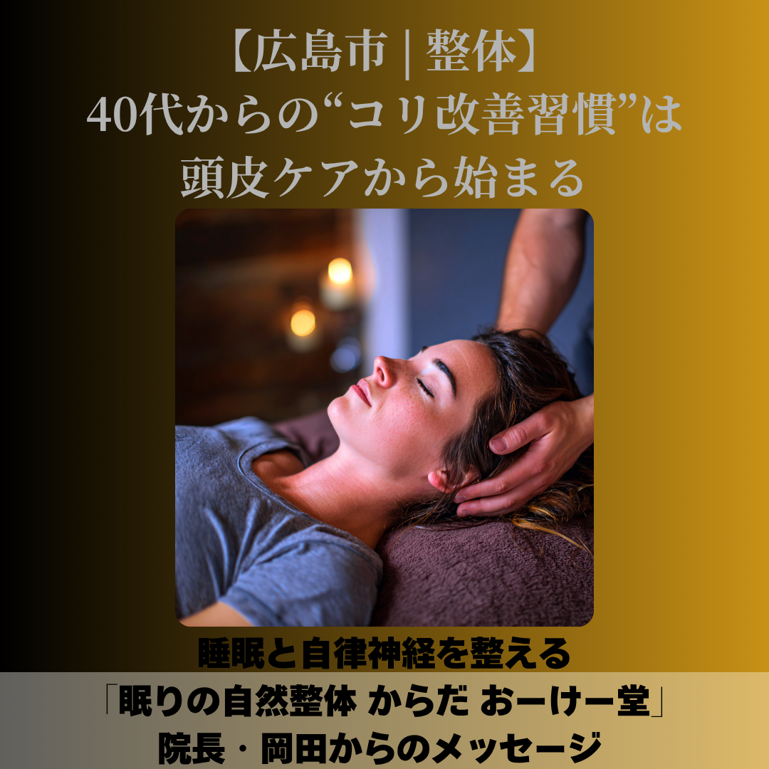 #広島市整体 #広島市中区整体 #広島市南区整体 #自律神経整体 #睡眠改善 #頭皮ケア #肩こり改善 #腰痛改善 #更年期ケア #骨盤調整 #血流改善 #自然治癒力 #40代女性 #50代女性 #眠りの整体 #からだおーけー堂